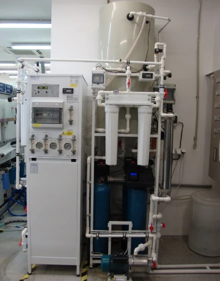 Úpravna RO EDI včetně systému UV lamp. Úpravna RO EDI (reverzní osmóza s elektrodeionizací sloučená v jedné úpravně) je určena pro farmacii a laboratoře, které potřebují vodu o čistotě ≥15 MΩ cm. Jedná se o výrobu velmi čisté vody bez použití iontoměničů. Takto zvolená technologie dosahuje velkých finančních úspor oproti běžným úpravnám používající iontoměniče (minimální náklady na servis RO EDI). |